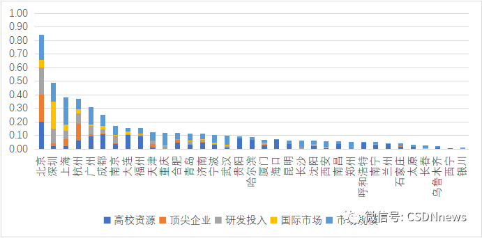 开发者中心城市的成长性评价得分由高校资源、顶尖企业、研发投入、国际市场和市场规模五项指标组成,旨在衡量开发者在城市成长与发展的机会与环境。