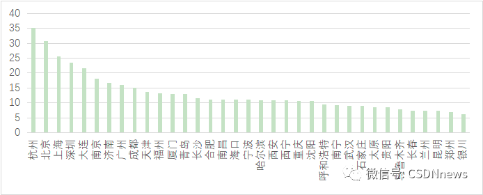 领先城市为上海、深圳和杭州,三座城市的开发者综合评价得分分别为 54 分、 52 分和 44 分,与北京差距明显,但较其他城市仍有显著优势。