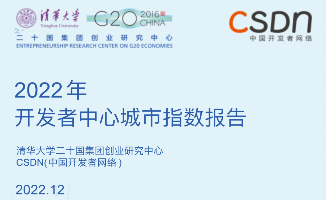 为此,基于数字经济时代最重要的人才资源——开发者,清华大学二十国集团创业研究中心与中国开发者网络(CSDN)重磅发布了双方合作完成的《2022 年开发者中心城市指数报告》。