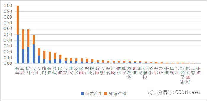 开发者产出包括技术产出和知识产权产出两个主要维度。从两方面的表现来看, 北京是开发者产出评分最高的城市。排名前十的城市依次为北京、深圳、上海、杭州、广州、成都、南京、武汉、西安、郑州。