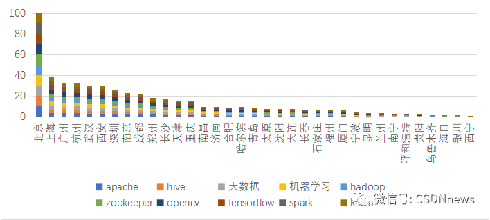 报告对 CSDN 社区中热点领域的技术关键词进行了检索,选择了发布博客人数最多的十个技术领域进行分析,按发表博客人数从高到低排列依次是 Apache、Hive、大数据、机器学习、Hadoop、ZooKeeper、OpenCV、Tensorflow、Spark 和 Kafka。其中,Web 服务器软件 Apache 是最热门的技术话题,博客发布者超过 34 万人,而开源流处理平台 Kafka 的博客发布者数量相对较少,约 5.2 万人。为了消除不同技术主题博客发布者数量的差异,报告对 10 个主题的发布者人数分别进行了标准化处理,避免某一城市的开发者仅在一项技术中产出较多而带来的评价偏差。