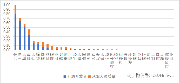 北京、上海、杭州、深圳、成都、广州、南京、武汉、西安、重庆、长沙、厦门等城市参与到高影响力开源项目的开发者数量最多;