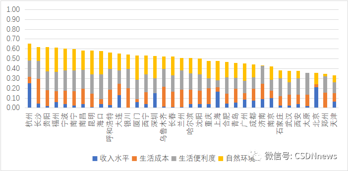 杭州是开发者生活易得性评分最高的城市。排名前十的城市依次为杭州、长沙、贵阳、福州、宁波、南宁、南昌、昆明、海口和呼和浩特。