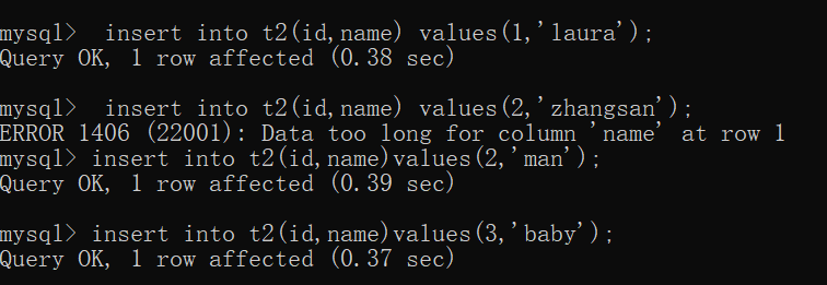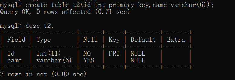 eg:create table t2(id int primary key, name varchar(5));