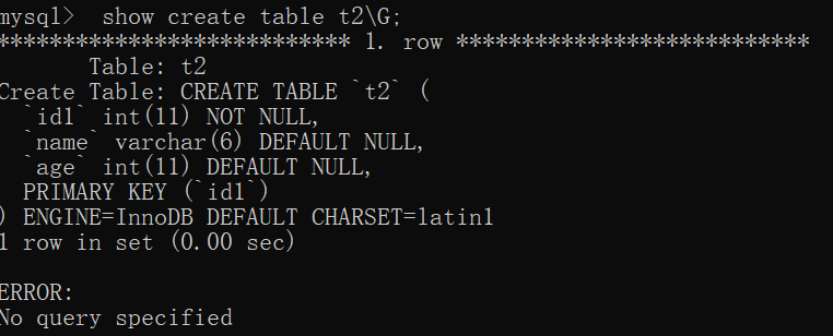 mysql> show create table t2;