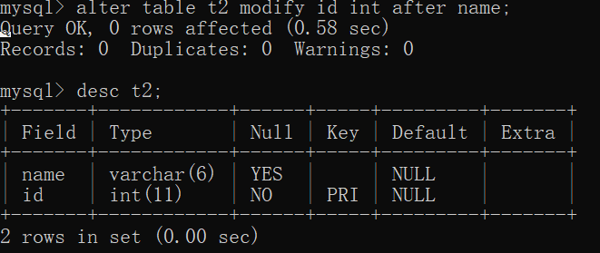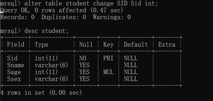 eg:alter table t1 change id idd int;