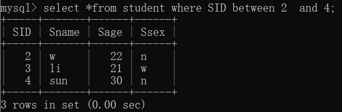 eg:select * from Student where SID between 3 and 7;