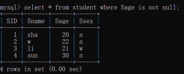 eg:select * from Student where Sage is not null;