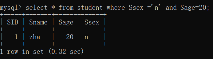 eg:select * from Student where Ssex =’nan’ and Sage=20;