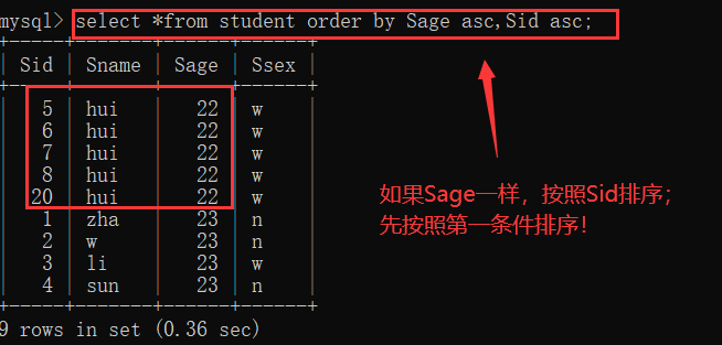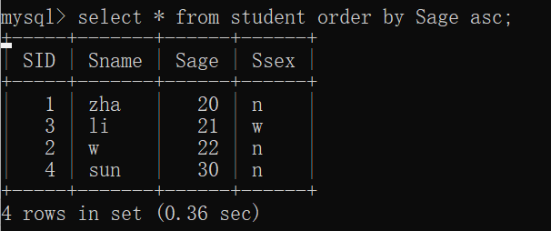 eg:select * from Student order by SID asc;