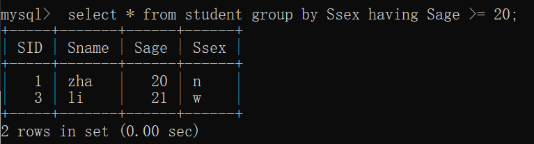 eg:select * from Student group by Ssex having Sage >= 18;