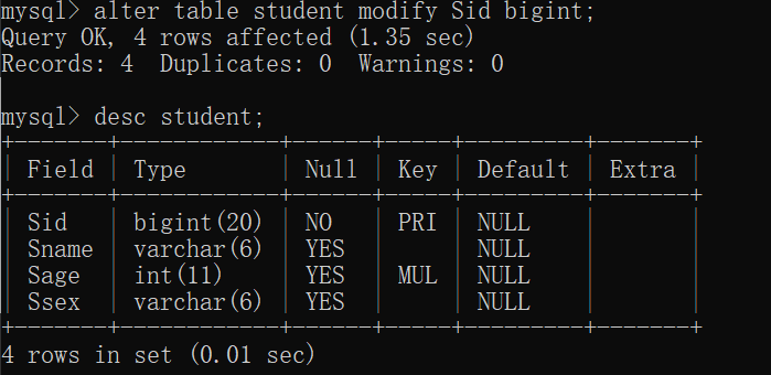 3.1.2、修改表中字段类型SQL:
