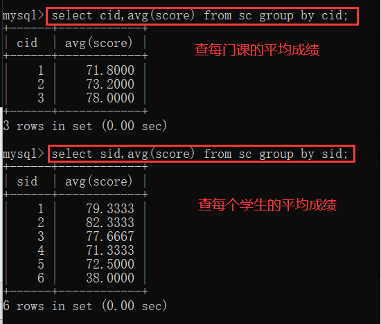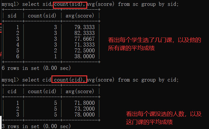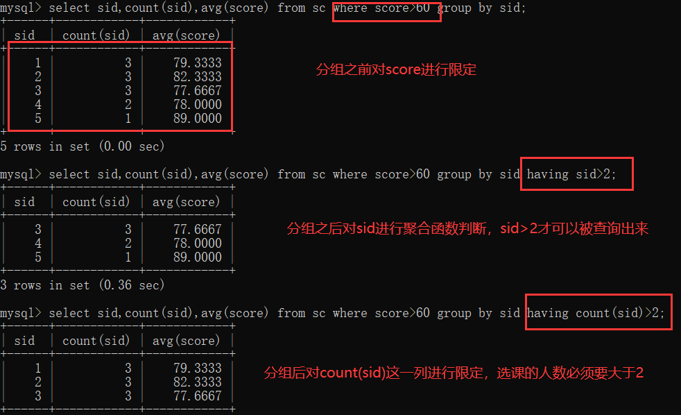 分组之前可对条件进行一些限定操作:成绩不及格的不参与分组:where操作限定;新要求:分组之后,每门课的选课人数要大于两个人 having操作对分组之后的表进行限定操作;