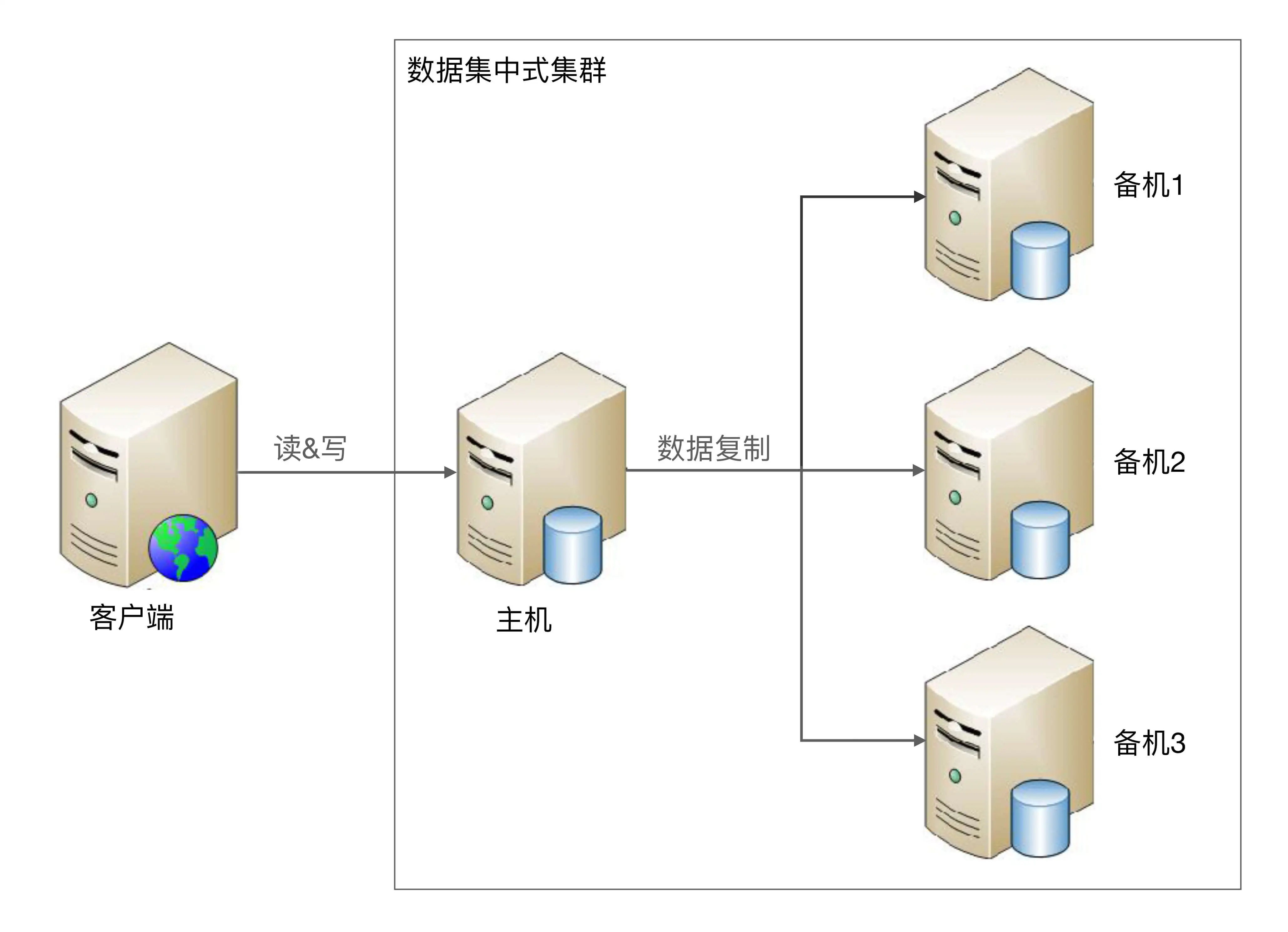 使用多台服务器来存储数据即为数据集群架构,集群指的是多台(至少三台)机器组合在一起形成一个统一的系统,根据集群中机器承担的不同角色可分为两类:数据集中集群和数据分散集群。