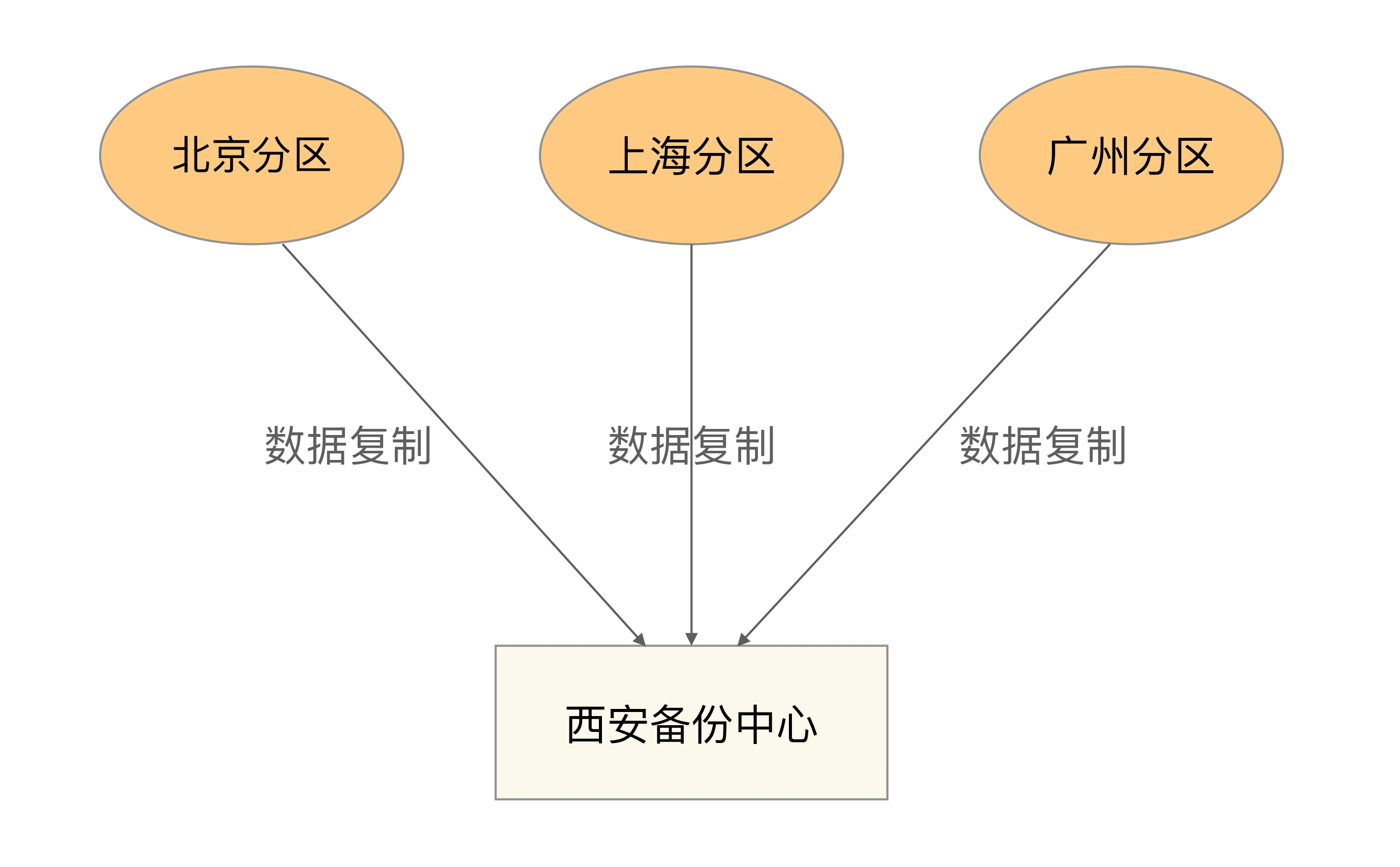 - 扩展容易,如果要增加第四个分区(例如,武汉分区),只需要将武汉分区的数据复制到西安备份中心即可,其他分区不受影响。