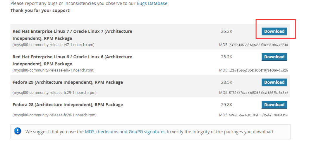 打开网址:https://dev.mysql.com/downloads/repo/yum/,选择对应linux版本