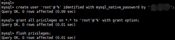 create user ‘root’@’%’ identified with mysql_native_password by ‘你的密码’;