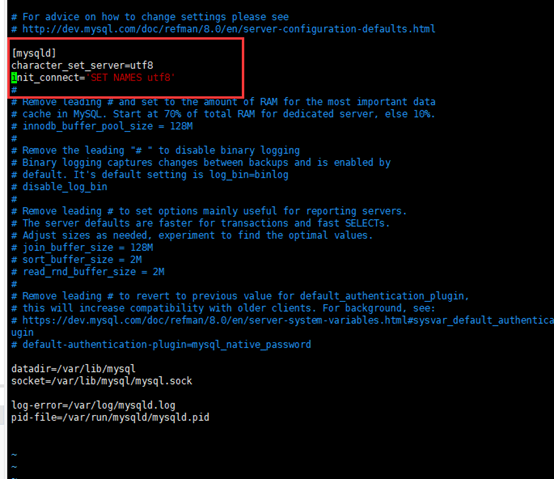 修改/etc/my.cnf配置文件,在[mysqld]下添加编码配置,如下所示: