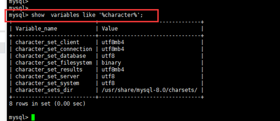 十三、 查看下编码:mysql> show variables like ‘%character%’;