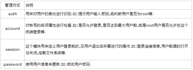 | PAM模块 | 结合管理类型 | 说明 | ||