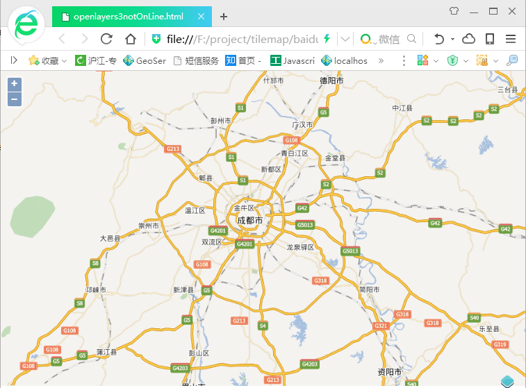 Openlayers3加载离线百度瓦片地图,效果以及代码如下: