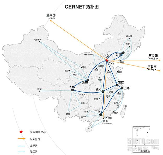 CHINANET骨干网由北京、上海、广州、沈阳、南京、武汉、成都、西安等8 个核心节点组成的核心层和其它54 个汇接节点组成的汇接层组成。全网有3 个国际出口,通过京、沪、穗的路由器完成。国际路由器与国内路由器独立设置,并负责实现各国际策略及安全性限制。CHINANET 网络节点间的中继电路采用基于SDH 和DWDM 的光纤网络,网络总带宽超过800G,国际出口总带宽已超过5000Mbp