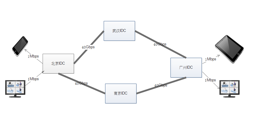 假如一个主播在北京进行直播(音视频消耗带宽为1Mbps),在全国有10K人进行了收看。 那么北京IDC机房需要部署多少服务器和占用多少IDC带宽才能支持呢 ? 简单计算一下,10K * 1Mbps = 10Gbps,在假设10Gb网卡的服务器CPU和内存能够处理的50%流量和包, 理论上2个万兆网卡的服务器的可以支持。 一般用户和服务器配比为 20K用户:1台服务器, 那么如果百万级的用户在全国观看直播需要多少服务器支持呢,简单计算 50台服务器即可,那么怎么安排这些服务器在全国的IDC中呢, 因为在每个IDC服务的用户不同,最合理的方式的服务器的分布方式,应该参考这个地区的人口数的比例 来确定分布的比例较为合理。