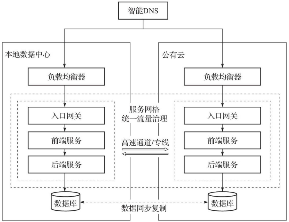因此,对于容灾能力要求更高的业务,就需要通过异地多活这样的地域级容灾能力来实现。用户可以在单一云厂商的不同区域搭建多个集群,也可以选择在不同云厂商的不同区域搭建多个集群,或者分别在线下IDC和线上云厂商的不同区域搭建集群,实现业务应用的异地多活部署。图1展示了混合云场景下IDC内的容器集群和公有云上容器集群Active-Active的部署。在异地多活架构下,应用的业务负载同时部署在多个集群上,然后使用一个全局的DNS服务将请求转发至对应的后端集群,当其中一个集群发生故障,无法处理请求时,DNS服务会自动处理并转发请求到健康的集群上。