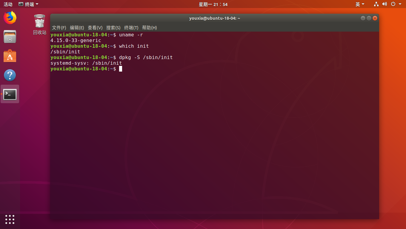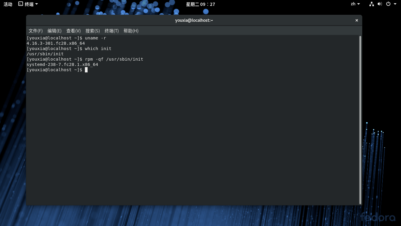 在最新的 Ubuntu 18.04 和 Fedora 28 中,init 又属于哪个软件包呢?Fedora 28 是 Redhat 流派的,所以其考察方法同前。Ubuntu 使用 dpkg 包管理软件,其考察流程是这样的:运行which init,得到路径/sbin/init,再运行dpkg -S /sbin/init,得到其软件包是 systemd。从前面的截图可知,Fedora 28 的 init 程序也是属于 systemd。知道一个软件属于哪个软件包,我们才好做功课,不是吗?在这里,我们可以用搜索引擎搜 systemd 关键字,也可以在系统中使用man systemd查看它的文档。