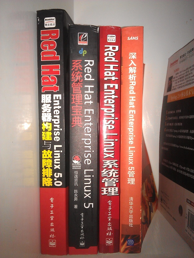 如何使用 Linux 是一门比较系统的学问,所以教科书是很有必要看那么几本的。我最开始学习 Linux,是十几年前,那时天天抱着一本《Redhat Linux 9宝典》啃,看清楚哦,是 Linux 9,而不是 Enterprise Linux 9。从那个版本后,Redhat 开始发行 Enterprise Linux,每两年一个版本,现在已经到第 7 版了。我后来也相继买了不少 Linux 方面的书,如下图,是我书柜一角的照片: