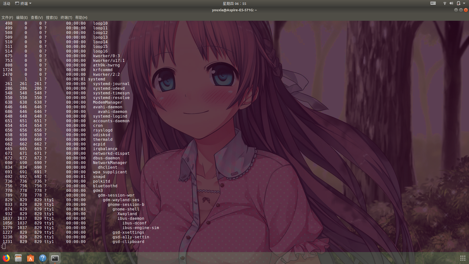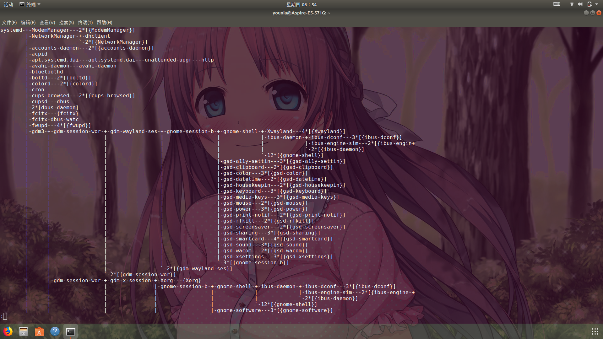 说到 GDM,我就多谈几句。以前我使用 Linux 桌面的时候,总是有一个误区:认为只有 XServer 启动后,才能够访问到图形系统,否则只能访问字符界面。随着对 Linux 的认识逐步加深,才发现即使在 XServer 启动之前,图形界面也是无处不在的。例如,Grub 的系统启动菜单,可以是图形化的,还可以通过改背景和主题进行美化。再例如在 Linux 初始化过程中,有一个 PlyMouth 软件,可以直接通过内核的 DRM 模块访问图形硬件,从而显示一个图形化的启动界面和进度条,同理,PlyMouth 也是可以通过更改主题进行美化的。最后,当 Linux 初始化完成后,会给我们显示一个让我们登录的图形界面,这就是 DM(Display Manager),这个 DM 既是 XServer 的父进程,负责启动 XServer,又是一个 XClient,给出图形化的登录接口。登录成功后,它又是 Gnome Shell 的父进程,负责启动 Gnome Shell。我花了很长时间才理解什么是 DM (Display Manager,显示管理器),才把它和 Linux 桌面系统中的窗口管理器(Window Manager)区分开来。以前 Ubuntu 使用的 DM 是 lightdm,现在回归 Gnome 3 后,就统一使用 Gnome 的 GDM 了。我后面会有一篇随笔专讲 X Window,到时候再详细讲解 Display 的概念,理解了 Display,再理解 Display Manager 就不难了。还有,即使在纯字符界面下,也是可以使用 FrameBuffer 获得图形功能的,我后面也会有一篇随笔,专讲 Grub2、字符界面、FrameBuffer。