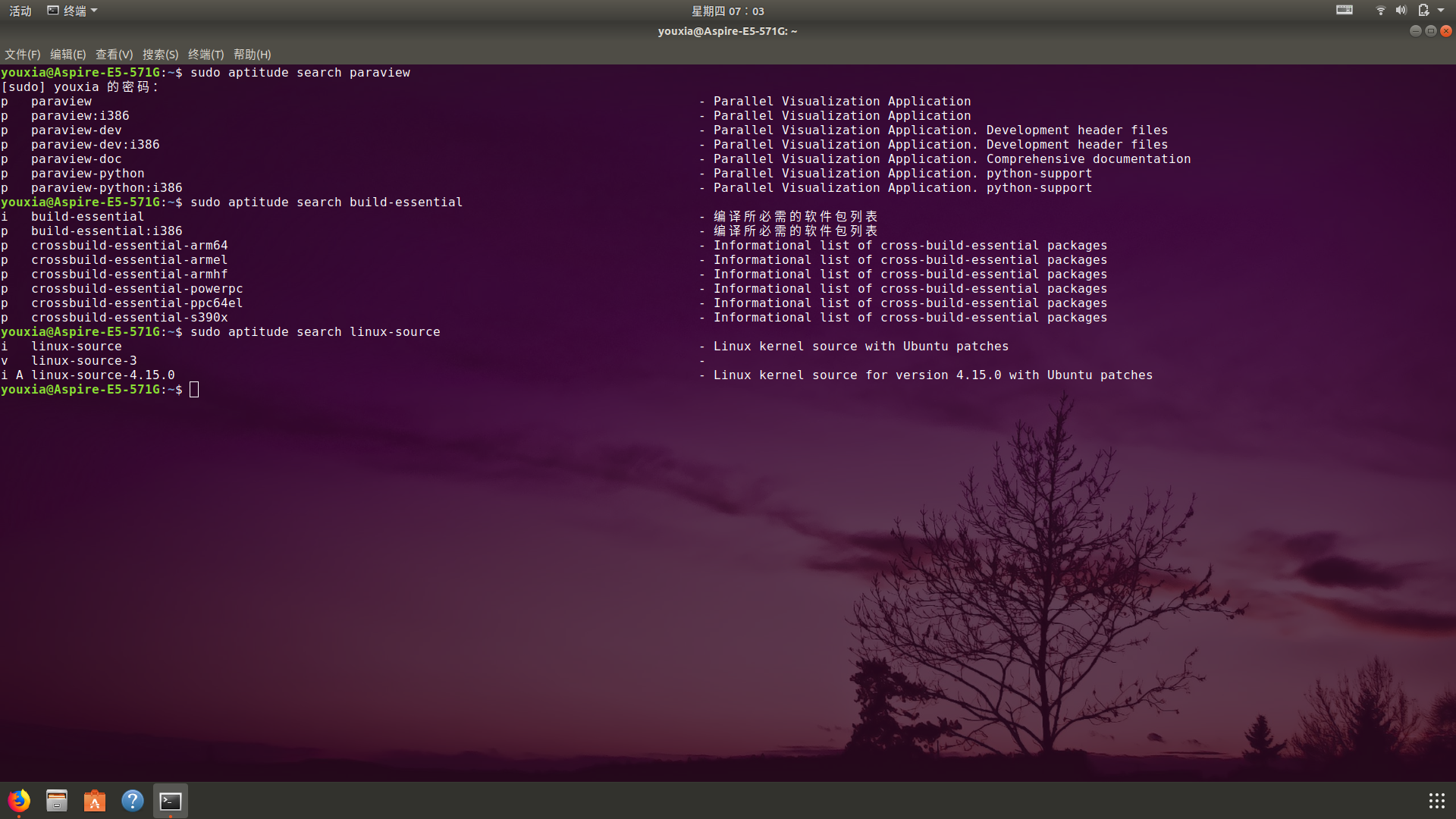 需要注意的是,Linux 内核源代码是单独打包的,所以要下载 Linux 内核的源代码的话,需要使用sudo aptitude install linux-source命令。