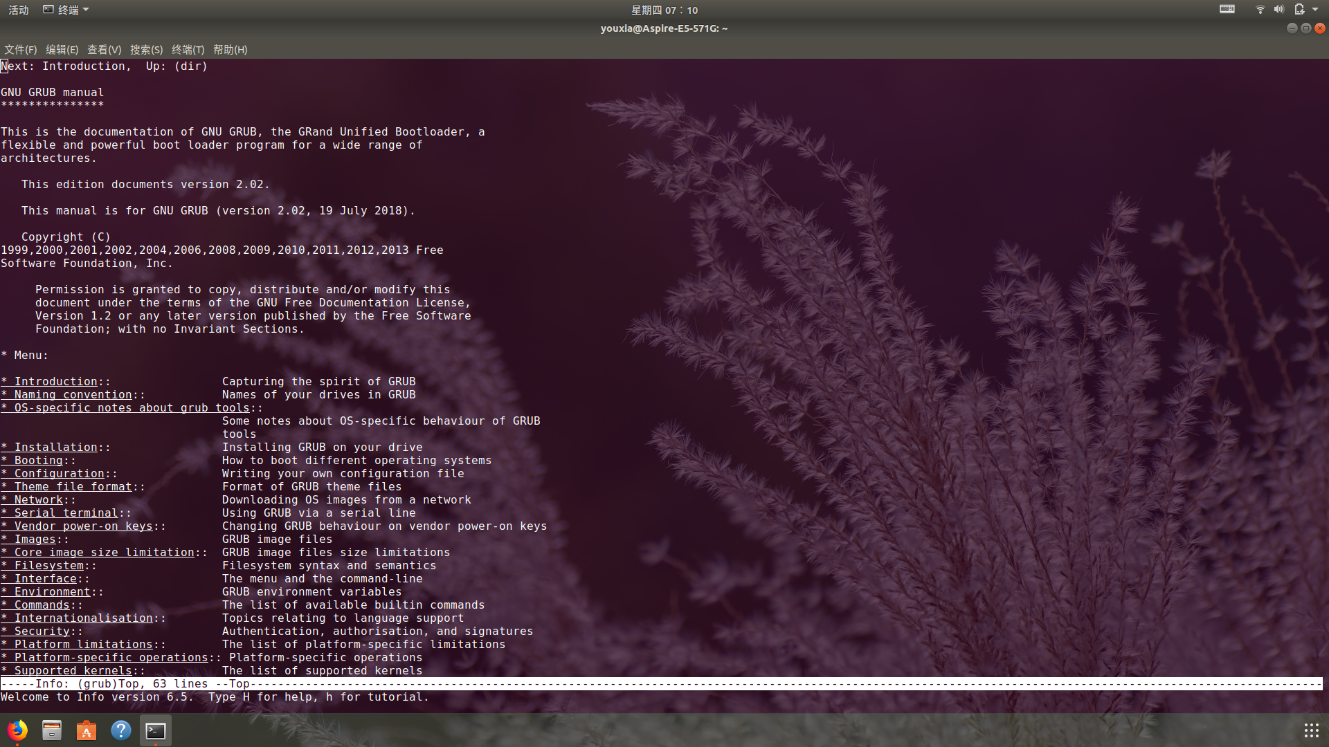 对于一些 GNU 提供的软件,有时提供的是 Info 格式的文档,可以使用info命令阅读。下面是我学习 Grub 时的截图,使用info grub就可以调出来。