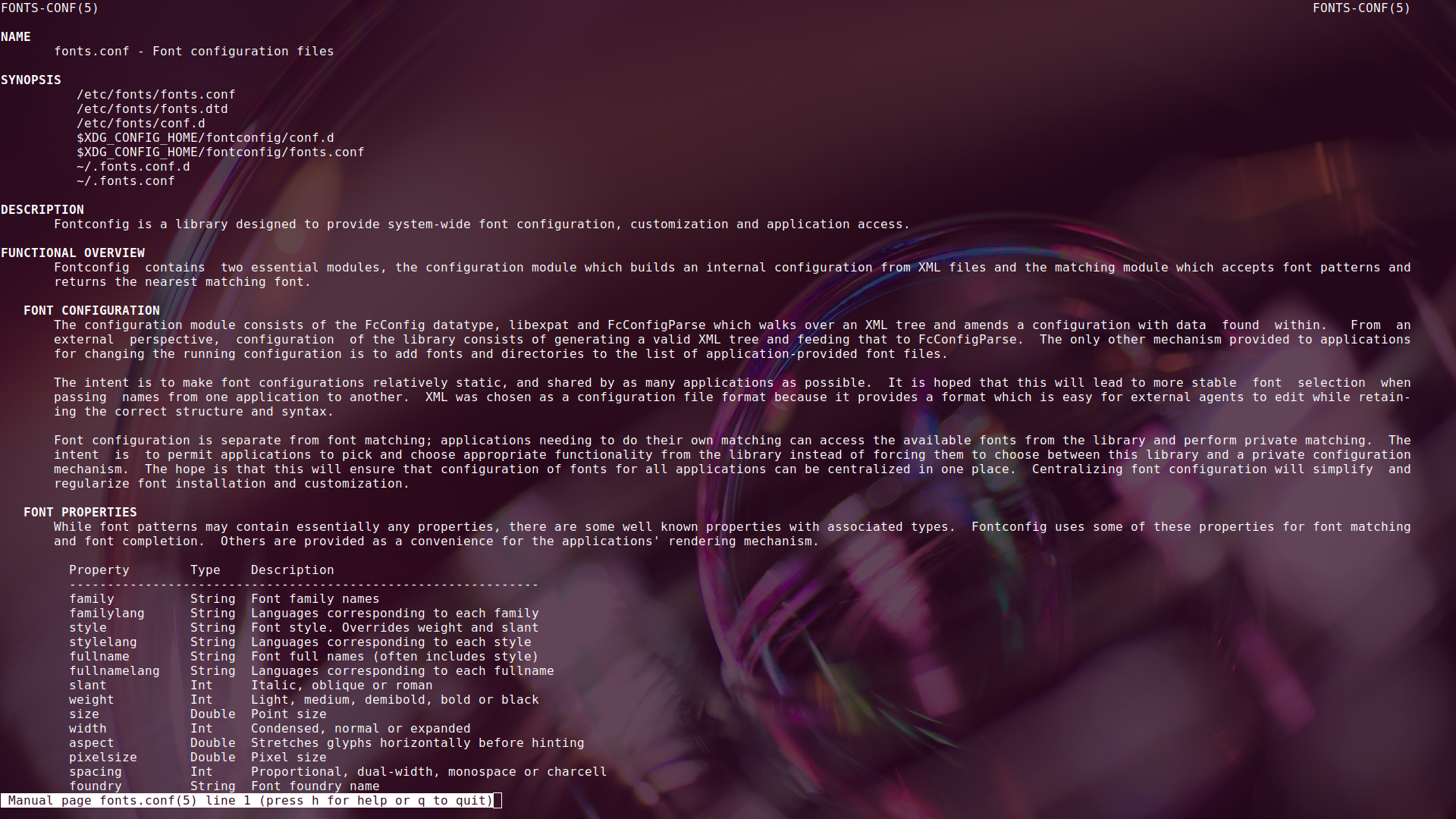 我学习 FontConfig 的时候,也是靠man fonts.conf来学习关于字体配置的语法的,如下图:
