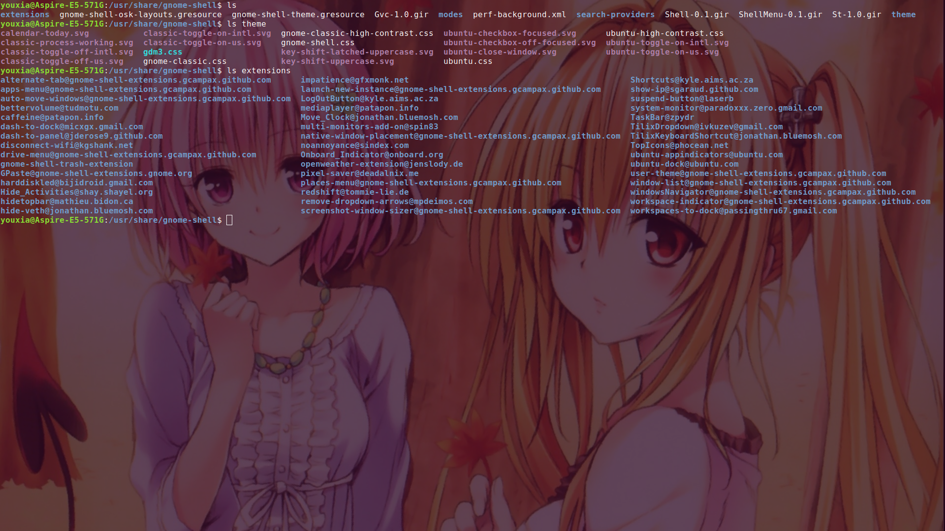 进入/usr/share/gnome-shell目录,可以看到这里有theme目录和extensions目录,分别看一下里面有哪些内容,如下图: