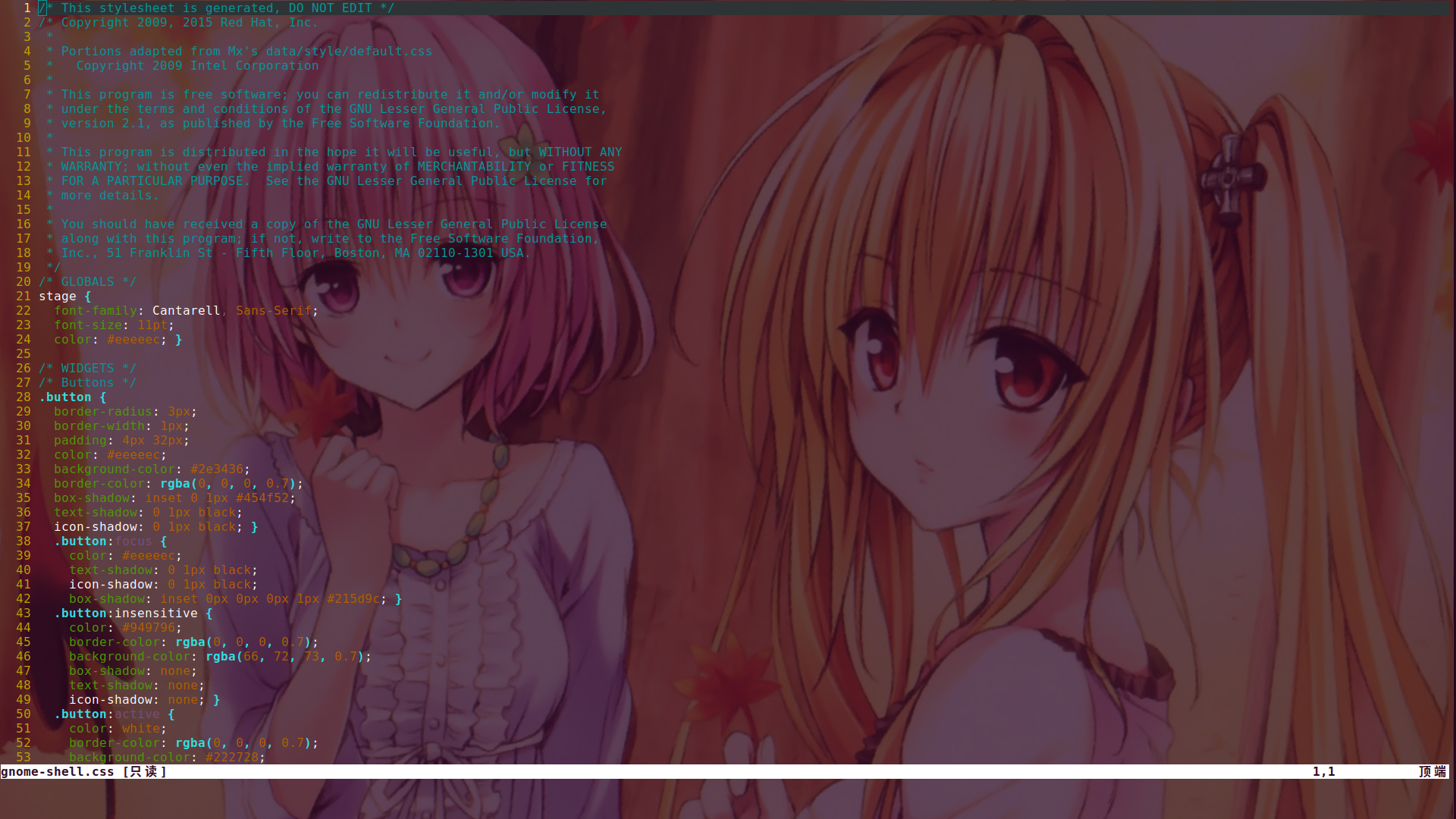使用sudo vim /usr/share/gnome-shell/theme/gnome-shell.css命令,可以查看这个 CSS 文件,如下图: