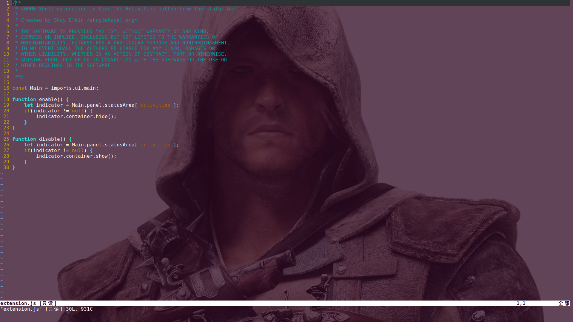最后再来学习一下 Gnome Shell 的扩展怎么写,这里选择一个最简单的 Hide Activities,就是掩藏左上角的那个“活动”按钮。进入/usr/share/gnome-shell/extensions/Hide_Activities@shay.shayel.org目录,使用 Vim 查看 extension.js,如下图: