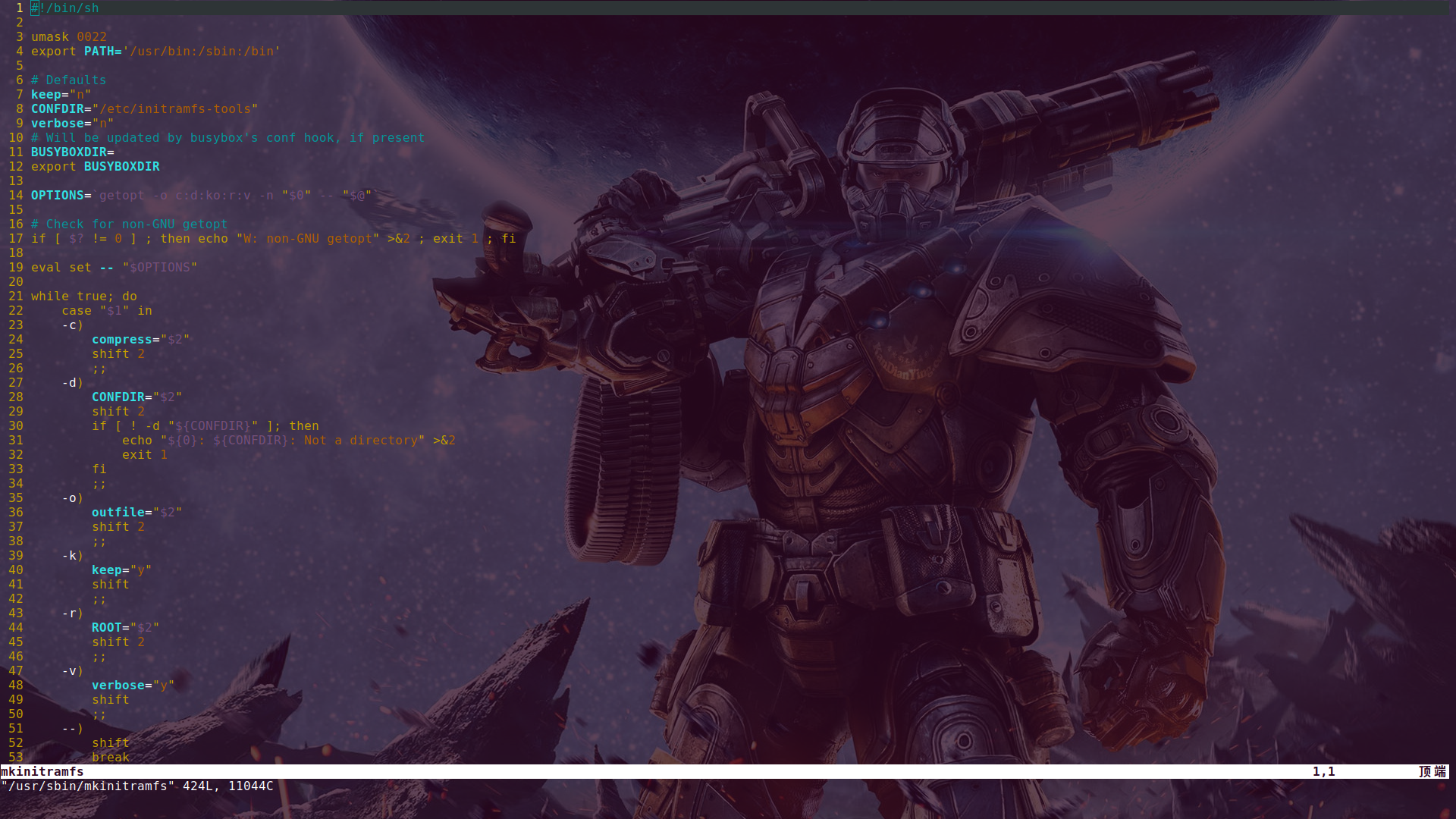 Linux 系统中还有一些功能是由脚本提供支持的,这些软件的源代码读起来更加方便。例如,制作 initrd 镜像文件的工具就是 Bash 脚本,在 Ubuntu 系统中,它在文件系统中的位置是/usr/sbin/mkinitramfs,使用 Vim 就可以阅读,如下图: