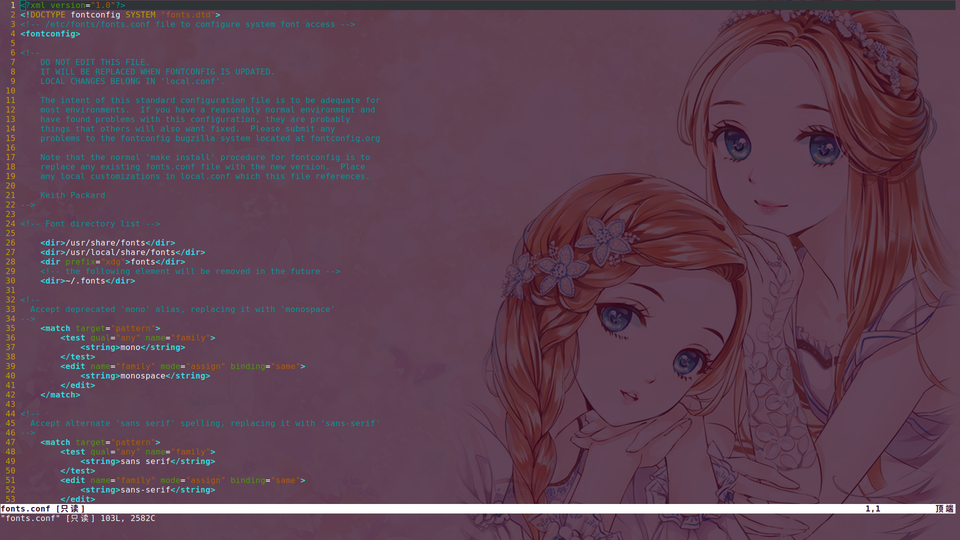 FontConfig 的配置文件是 XML 格式的,分别是/etc/fonts/fonts.conf文件和/etc/fonts/conf.d/目录下的所有文件。也可以直接使用 Vim 进行阅读和修改,如下图: