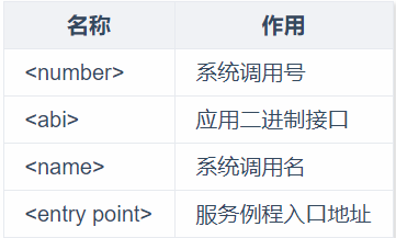 (1)系统调用号与系统调用表:Linux内核中设置了一张系统调用表,用于关联系统调用号及其相对应的服务例程入口地址,定义在./arch/x86/entry/syscalls/syscall_64.tbl文件中,每个系统调用占一个表项,一旦分配好就不可以有任何变更。