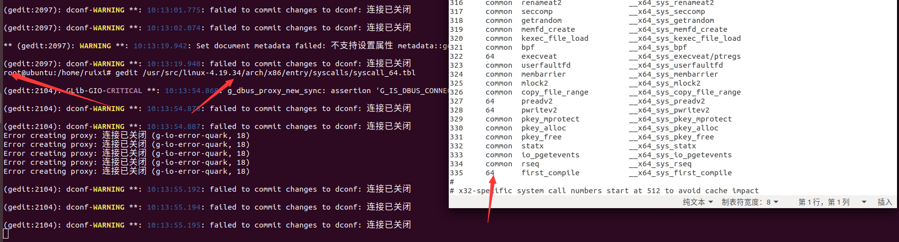 gedit /usr/src/linux-4.19.25/arch/x86/entry/syscalls/syscall_64.tbl