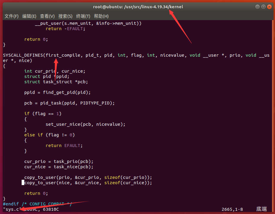 $cd /usr/src/linux-4.19.34(换成自己的版本即可)/kernel vim sys.c