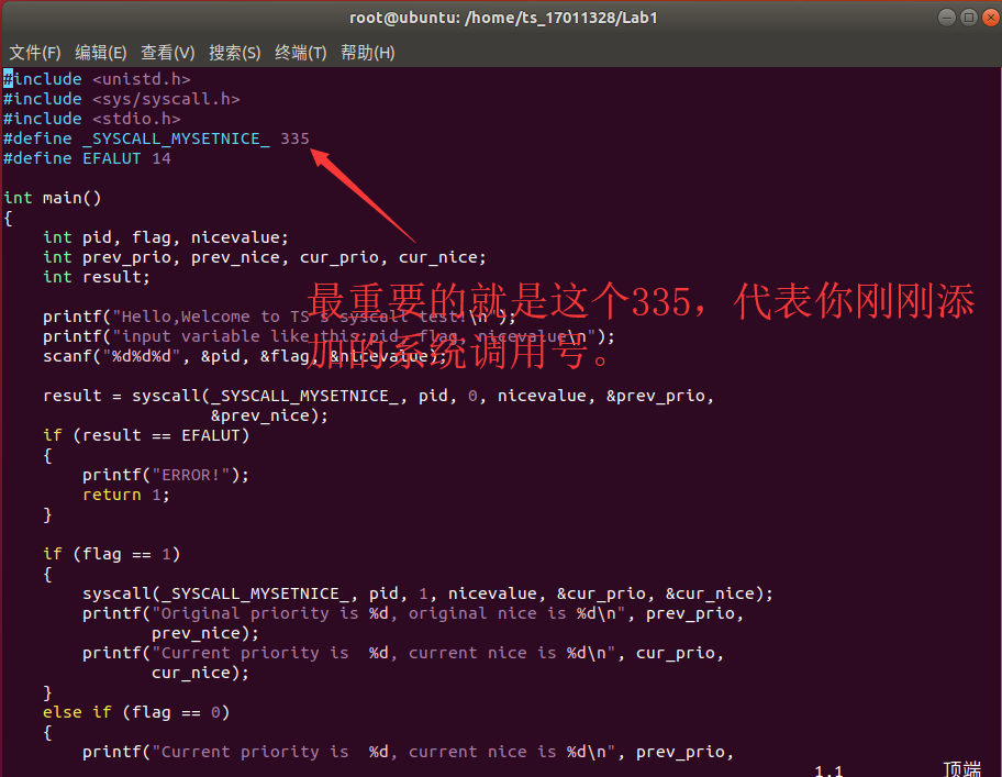 在sys.c中编程时,格式是SYSCALL_DEFINE5(mysetnice, pid_t, pid, int, flag, int, nicevalue, void __user *, prio, void __user *, nice) N=5代表参数的个数。