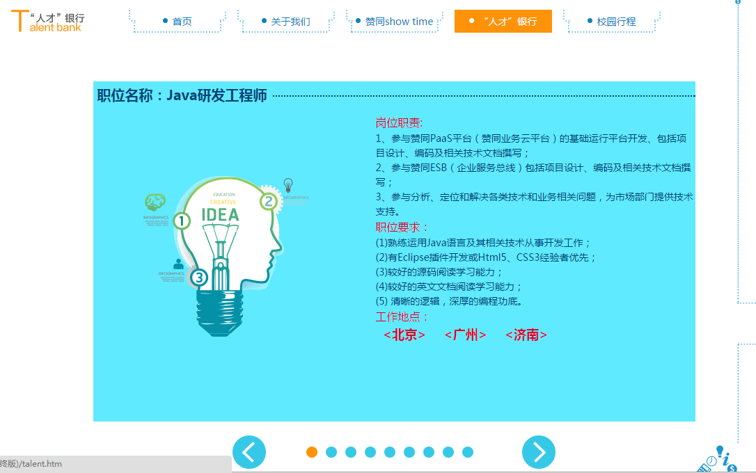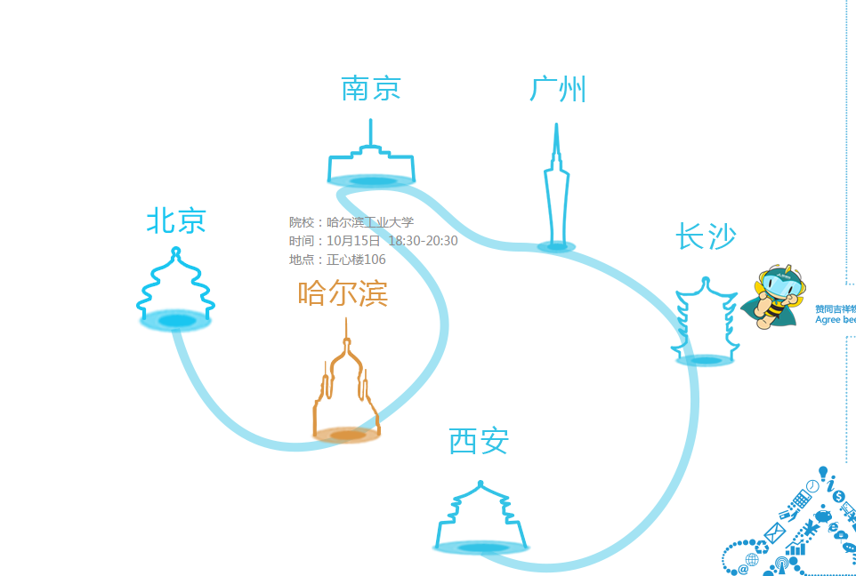 1 <div class="runschool"> 2 <div class="end beijing"> 3 <div class="bg_beijing bg_beijing_hover" normal="bg_beijing"></div> 4 <p class="bj block">院校:北京工业大学<br/> 5 时间:9月24日 18:30-20:30<br/> 6 地点:信东楼202<br/> 7 院校:北京航空航天大学<br/> 8 时间:10月13日 18:30-20:30<br/> 9 </div> 10 <div class="end haerbin"> 11 <div class="bg_haerbin" normal="bg_haerbin"></div> 12 <p>院校:哈尔滨工业大学<br/> 13 时间:10月15日 18:30-20:30<br/> 14 地点:正心楼106<br/> 15 </p> 16 </div> 17 <div class="end nanjing"> 18 <div class="bg_nanjing" normal="bg_nanjing"></div> 19 <p class="font">院校:南京理工大学(孝陵卫校区)<br/> 20 时间:10月19日 18:30-20:30<br/> 21 </p> 22 </div> 23 <div class="end guangzhou"> 24 <div class="bg_guangzhou" normal="bg_guangzhou"></div> 25 <p>院校:华南理工大学(大学城校区)<br/> 26 时间:10月21日 18:30-20:30<br/> 27 地点:大学城校区A4-301 28 </p> 29 </div> 30 <div class="end changsha"> 31 <div class="bg_changsha" normal="bg_changsha"></div> 32 <p class="font">院校:湖南大学<br/> 33 时间:10月23日 18:30-20:30<br/> 34 </p> 35 </div> 36 <div class="end xian"> 37 <div class="bg_xian" normal="bg_xian"></div> 38 <p>院校:西安电子科技大学(南校区)<br/> 39 时间:10月26日 18:30-20:30<br/> 40 地点:新校区大学生活动中心116 41 </p> 42 </div> 43 </div> 44 </div> 45 </div> 46 <i class="y_icon"></i> 47 </div> 48 <script type="text/javascript"> 49 (function(){ 50 var $normal = $('[normal]'); 51 52 $normal.hover(function(){ 53 var currentClass = $(this).attr('normal'); 54 if(currentClass!='bg_beijing'){ 55 $(".bg_beijing").removeClass("bg_beijing_hover"); 56 $(".bg_beijing").siblings('p').removeClass('block'); 57 } 58 $(this).siblings('p').show(); 59 $(this).addClass(currentClass + '_hover'); 60 }, function(){ 61 var currentClass = $(this).attr('normal') 62 $(this).siblings('p').hide(); 63 $(this).removeClass(currentClass + '_hover'); 64 }); 65 }()); 66 </script>