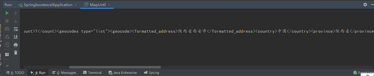 <?xml version="1.0" encoding="UTF-8"?> <response> <status>1</status> <info>OK</info> <infocode>10000</infocode> <count>1</count> <geocodes type="list"> <geocode> <formatted_address>陕西省西安市</formatted_address> <country>中国</country> <province>陕西省</province> <citycode>029</citycode> <city>西安市</city> <district></district> <township></township> <neighborhood> <name></name> <type></type> </neighborhood> <building> <name></name> <type></type> </building> <adcode>610100</adcode> <street></street> <number></number> <location>108.940174,34.341568</location> <level>市</level> </geocode> </geocodes> </response>
