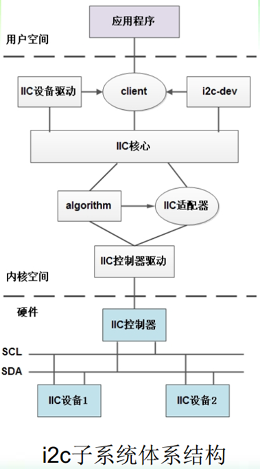 显然,它和前几次驱动类似, I2C也分为总线驱动和设备驱动,总线就是协议相关的,它知道如何收发数据,但不知道数据含义,设备驱动却知道数据含义