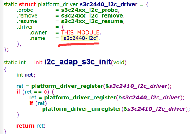 在init函数中,注册了一个 “s3c2440-i2c”的platform_driver平台驱动,我们来看看probe函数做了些什么