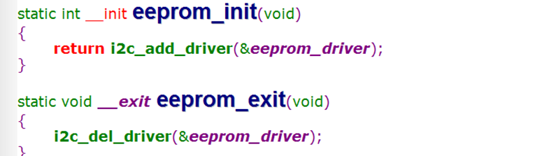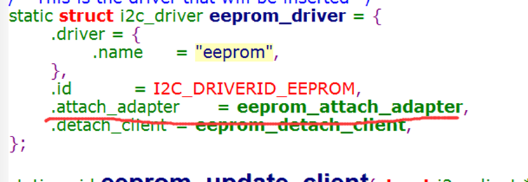 static struct i2c_driver eeprom_driver = { .driver = { .name = "eeprom", //名称 }, .id = I2C_DRIVERID_EEPROM, //IIC设备标识ID .attach_adapter = eeprom_attach_adapter, //用来与总线驱动的适配器匹配,匹配成功添加到适配器adapter中 .detach_client = eeprom_detach_client, //与总线驱动的适配器解绑,分离这个IIC从设备 };