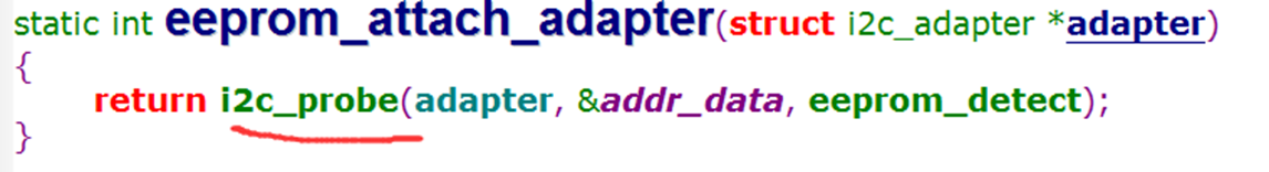 上图的第1个参数就是i2c_adapter适配器,第2个参数addr_data变量,里面存放了IIC设备地址的信息,第3个参数eeprom_detect就是具体的设备探测回调函数i2c_probe()函数,会通过adapter适配器发送IIC设备地址addr_data,如果收到ACK信号,就调用eeprom_detect()回调函数来注册i2c_client结构体,该结构体对应真实的物理从设备,而i2c_driver对应的是设备驱动,也就是说,只有当适配器支持这个设备驱动,才会注册i2c_client从设备,后面会讲这个回调函数如何注册i2c_client