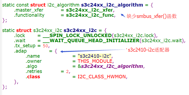static const struct i2c_algorithm s3c24xx_i2c_algorithm = { .master_xfer = s3c24xx_i2c_xfer, //主机传输 .functionality = s3c24xx_i2c_func, }; static struct s3c24xx_i2c s3c24xx_i2c = { .lock = __SPIN_LOCK_UNLOCKED(s3c24xx_i2c.lock), .wait = __WAIT_QUEUE_HEAD_INITIALIZER(s3c24xx_i2c.wait), .tx_setup = 50, //用来延时,等待SCL被释放 .adap = { // i2c_adapter适配器结构体 .name = "s3c2410-i2c", .owner = THIS_MODULE, .algo = &s3c24xx_i2c_algorithm, //存放i2c_algorithm算法结构体 .retries = 2, //重试次数 .class = I2C_CLASS_HWMON, }, };